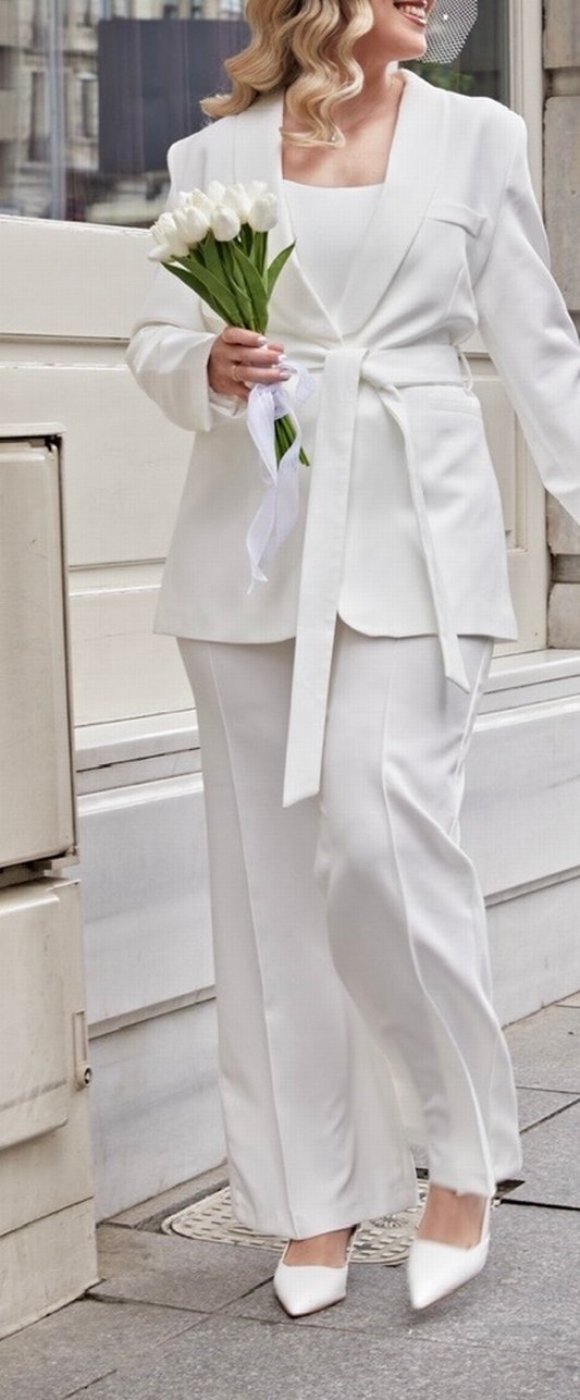 Beyaz renkli, kemerli midi uzunlukta kadın takım elbise. Klasik zarafet için kesik yakalı, askılı kollu ve modern kesime sahip. Nikahımda 1 kere kullandım . L beden . Alt pantolonda biraz daraltma yapılmıştır içinde payı mevcuttur. Yüksek bel pantolon.