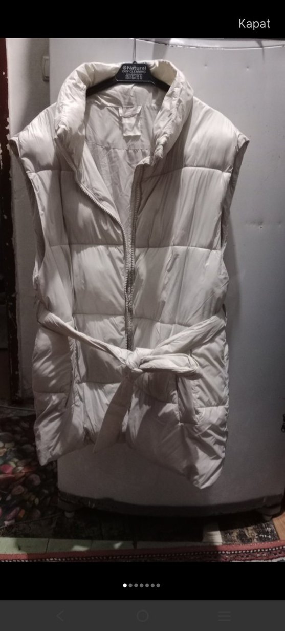 Beyaz, kemerli, kolsuz midi yelek. Halter yakalı ve yumuşak sentetik kumaştan üretilmiş, rahat ve dar kesim sokak stili sunar.