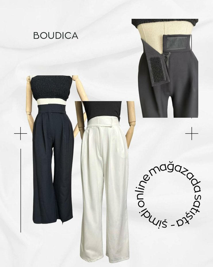 Beyaz renkte, kemerli ve normal kesim midi kumaş pantolon. Sentetik kumaştan üretilmiş, günlük kullanıma uygun minimal tarzda. İç bel kısmında BOUDICA yazısı bulunur.