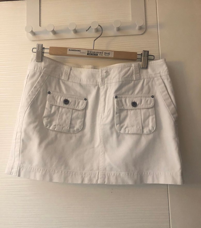 Pamuk kumaştan, kemerli ve cepli, beyaz renkli, dar kesim mini etek. Sokak stiline uygun, günlük kullanım için ideal.