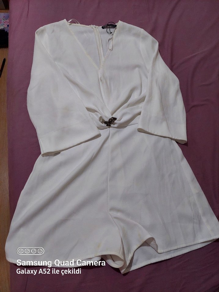 Beyaz, kemerli mini tulum, bol kesim, ince askılı ve V yakalı, ipeksi kumaştan, sokak stili için uygun.