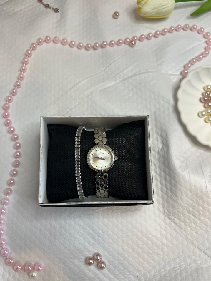 Beyaz kadranlı, kemerli gümüş kayışlı kadın saati. Minimalist ve çağdaş tarzı klasik zarafetle buluşturur. Yanında uyumlu bileklik bulunur. ⌚