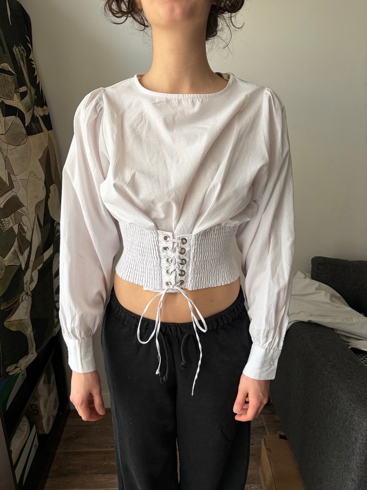 Beyaz pamuklu kumaştan, kemerli uzun kollu beyaz gömlek small ve medium kalıplara uygun