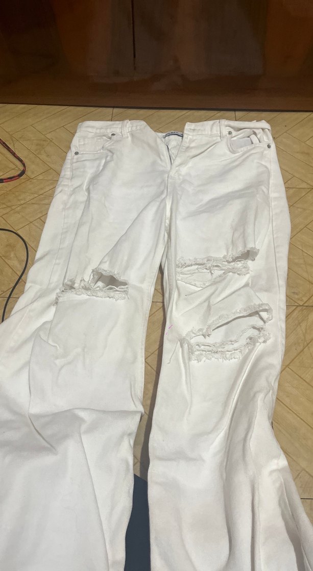 Beyaz keten kumaştan, kemerli ve yırtık detaylı, rahat kesim midi boy kadın pantolon. Günlük sokak stiline uygun parlak görünümlü.