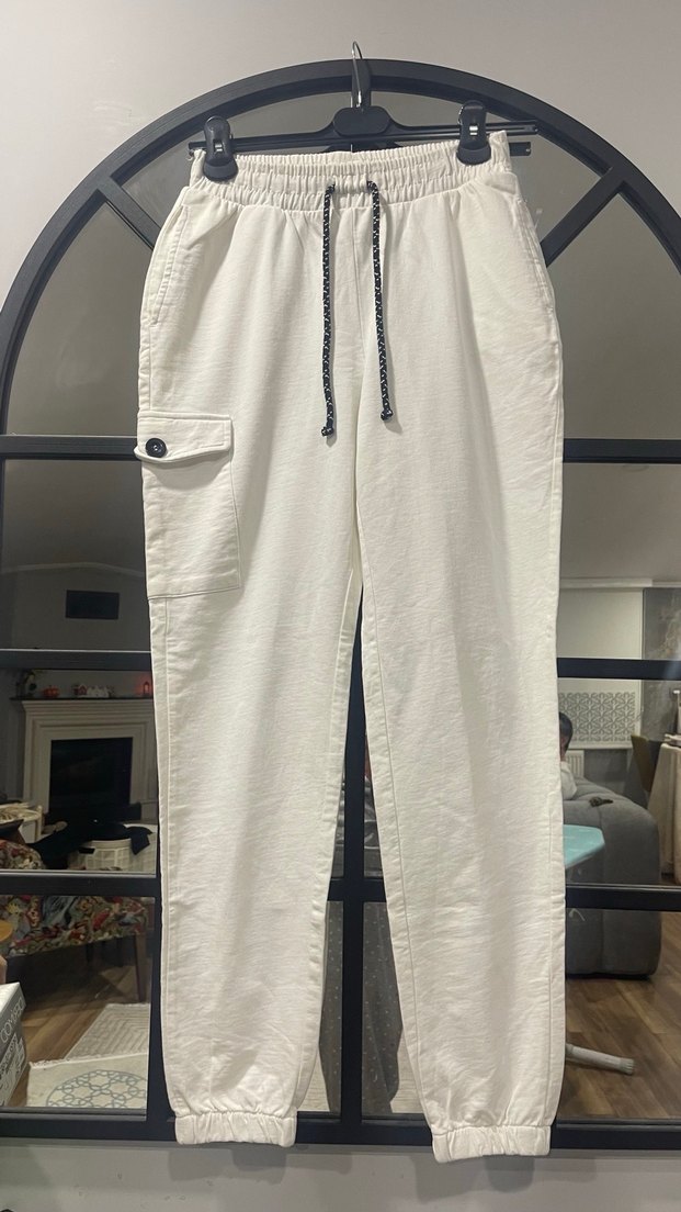 Beyaz keten pamuklu kumaştan, kemerli ve rahat kesime sahip uzun tam boy pantolon. Eşofman. Yanında düğmeli cep detayı bulunur, günlük sokak tarzına uygundur. Orjinal marka SIFIR ürün dür