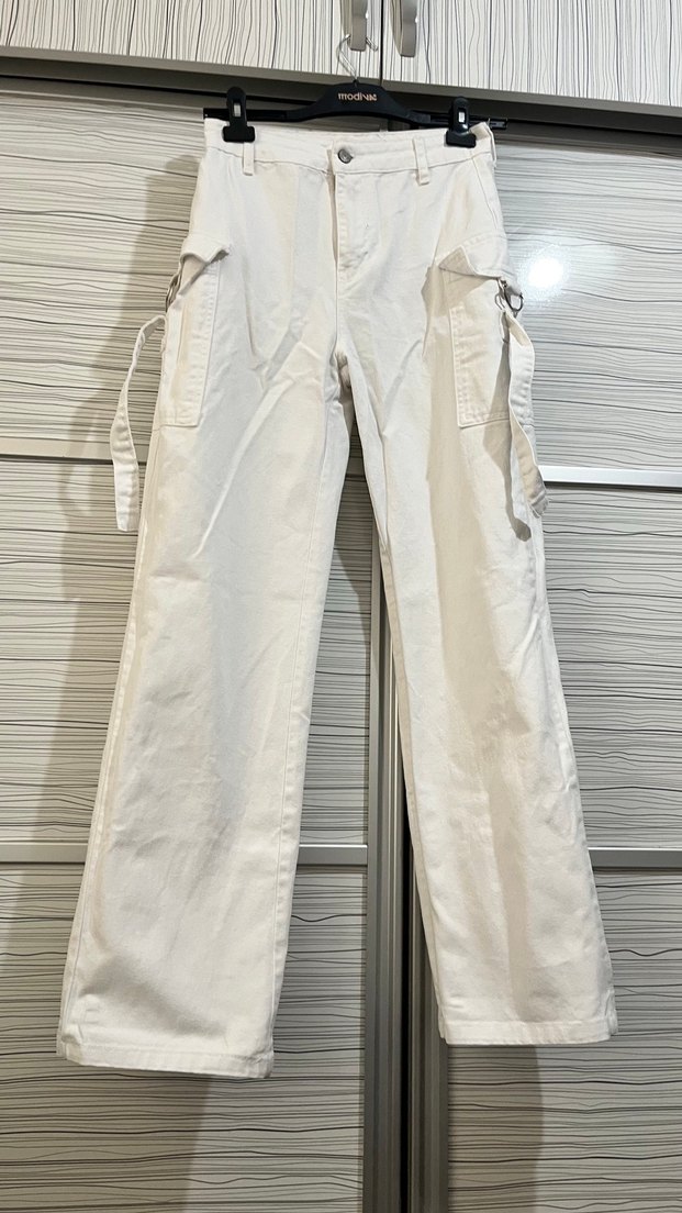 Beyaz renkli, kemerli ve yan cepli salaş kadın pantolon, sentetik kumaştan, günlük rahat kullanım için uygundur.