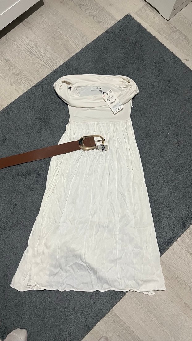 Beyaz, askısız uzun elbise, kemerli ve vücuda oturan kesime sahip, yumuşak keten kumaştan üretilmiştir. Minimalist ve bohem tarzıyla günlük kullanım için uygundur.