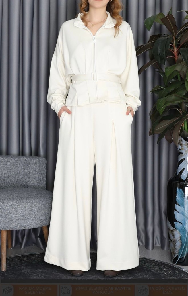Beyaz Kemerli Uzun Kadın Takım Elbise