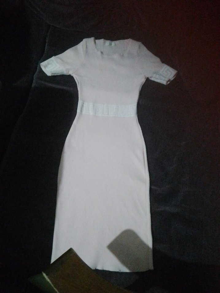 Kısa kollu, bisiklet yaka ve kemer detaylı, uzun beyaz elbise. Düz ve hafif sentetik kumaştan, günlük sokak stili için uygun. s m l uyumlu