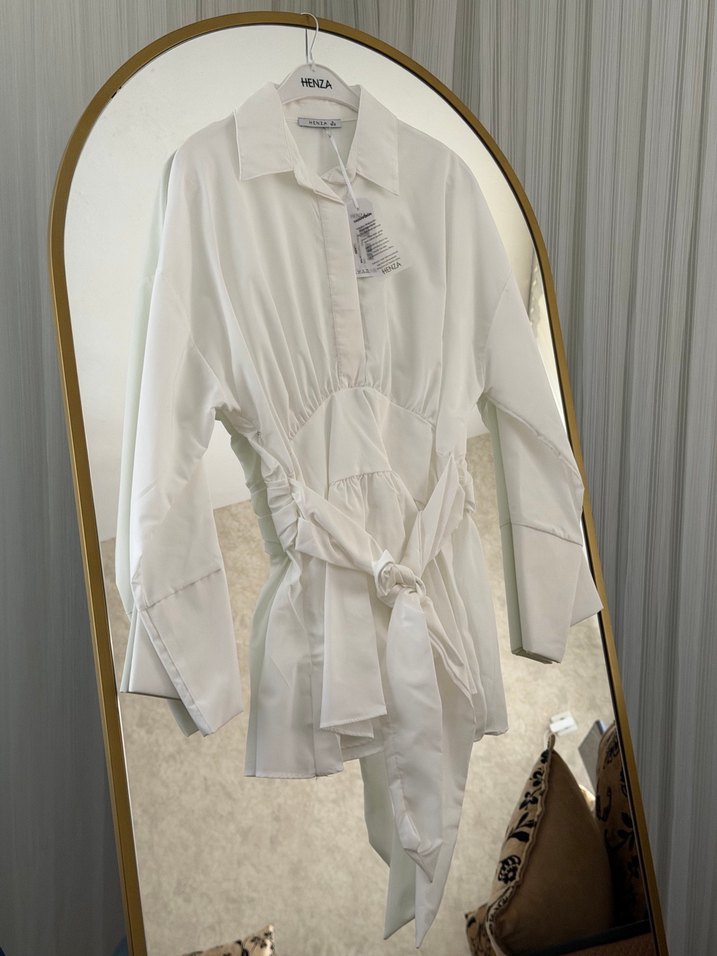 Beyaz keten kumaştan, uzun kollu ve yakalı. Kemer detayıyla bel vurgusu yapar, rahat kesimiyle şık ve modern bir görünüm sunar. 36-38-40-42 mevcut