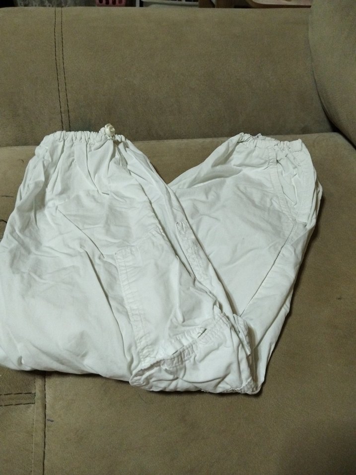 Beyaz keten kumaştan, rahat kesim ve midi boyda, sade ve konforlu dış mekan kullanımı için uygun pantolon. sarı lekeler beklemeden kaynaklı oluyor. çamaşır suyu ile bembeyaz