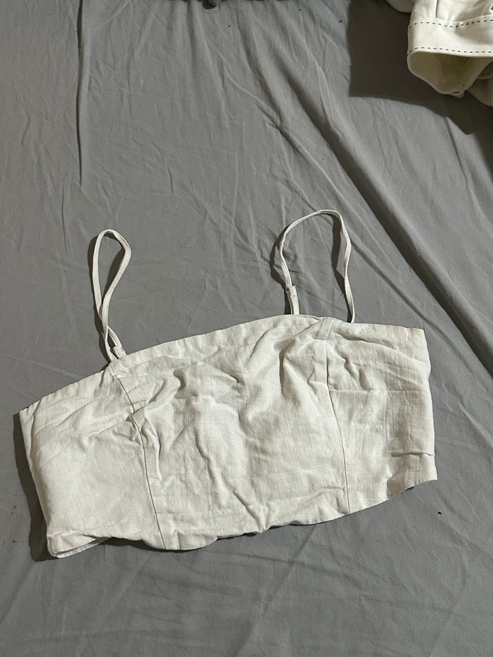 Beyaz keten askılı bustiyer, ince askılı ve vücuda oturan kesimiyle günlük sokak stiline uygun, minimal ve zahmetsiz şıklık sunar.