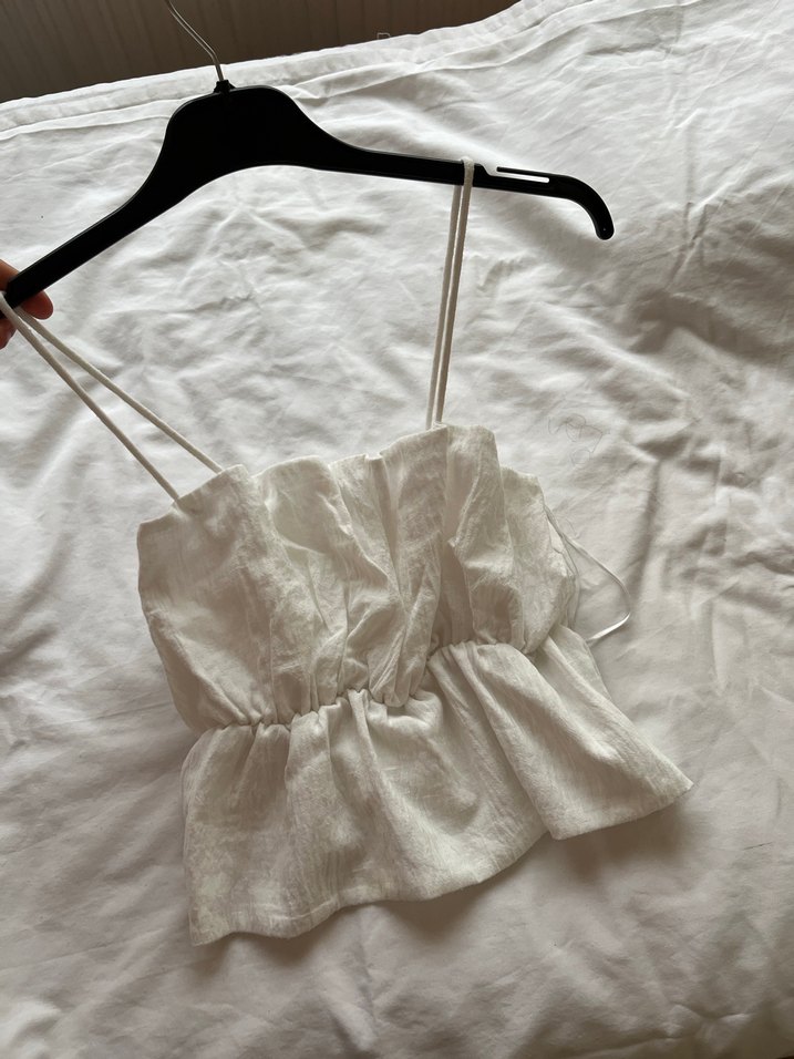 Beyaz keten kumaştan, askılı ve straplez yaka tasarımlı kız bluzu. Fırfır detaylı ve bol kesim, sokak modasına uygun.