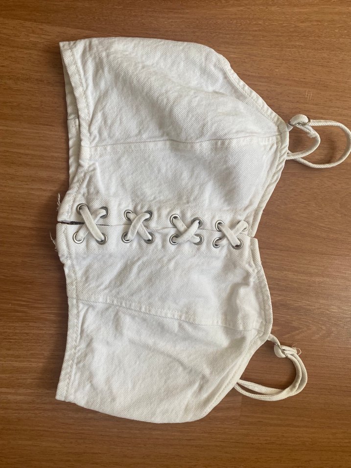 Beyaz keten, askılı, düğmeli ve bohem tarzda, vücuda oturan midi uzunluğunda büstiyer. Desensiz ve normal kesim.Kuşgözü detaylı