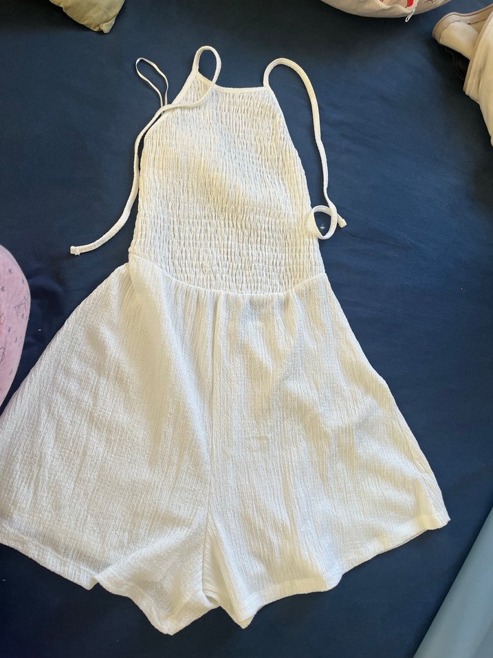 Beyaz keten kumaştan, askılı, straplez yaka ve bol kesim midi tulum. Minimalist ve bohem tarzda, günlük kullanım için uygundur.