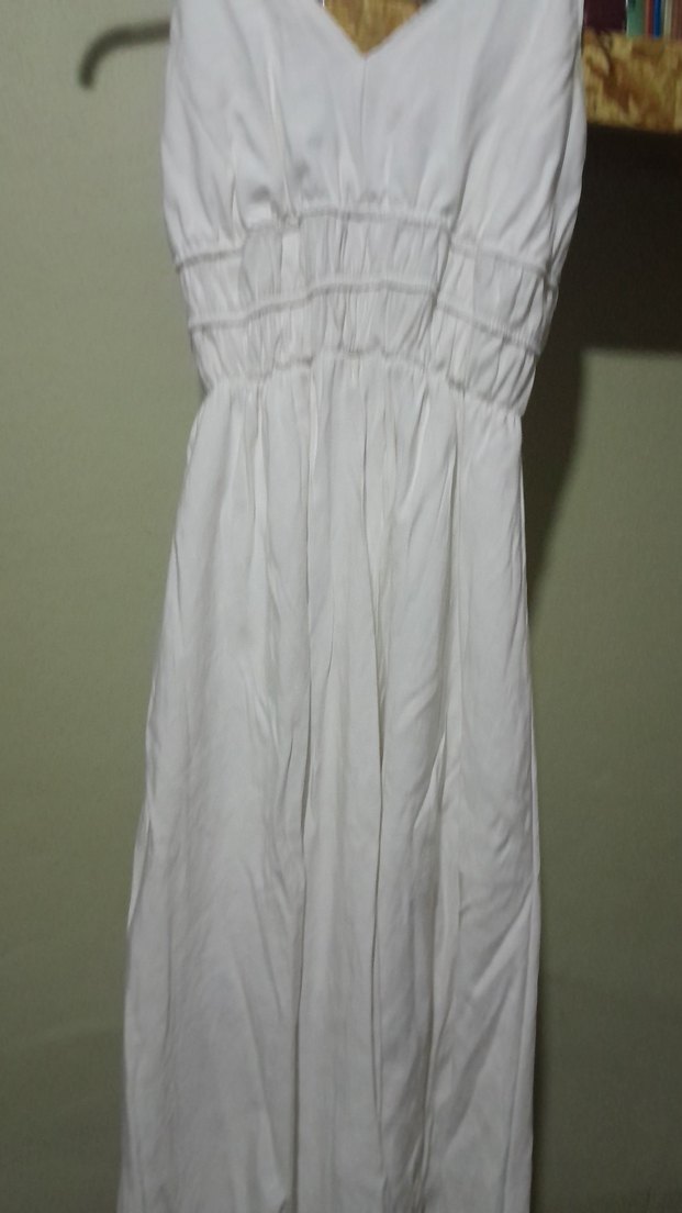 Beyaz keten kumaştan askısız, drapeli ve vücuda oturan uzun elbisedir. Minimalist ve bohem tarzı yansıtır, düğün için uygundur.