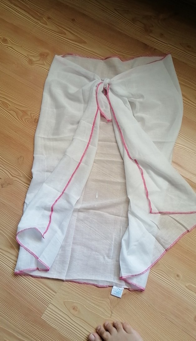 Hafif bohem tarzda, ince pembe kenarlıklı, beyaz keten kumaştan yapılmış kadın pareo