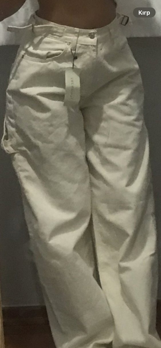 Beyaz keten kumaştan, bol kesim ve kemerli, midi boy rahat pantolon, günlük sokak stili için uygun.
