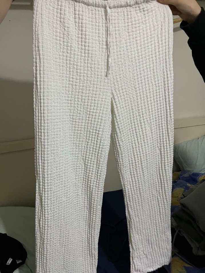 Beyaz keten kumaştan, bol kesim ve pliseli detaylara sahip midi boy kadın pantolon. Rahat ve sade tarzıyla günlük kullanıma uygundur. İç çamaşırına göre iç gösterebiliyor