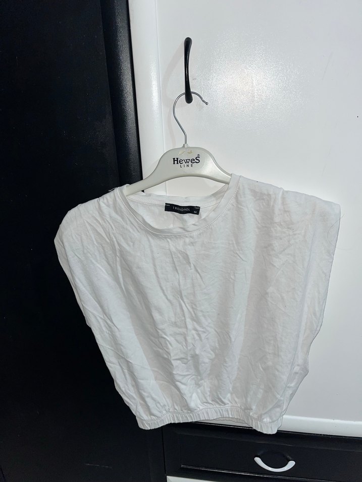 Beyaz keten crop top, yuvarlak yaka ve kısa kollu. Bol kesim ve kısa boy, minimalist ve desensiz, günlük sokak stili için uygundur.