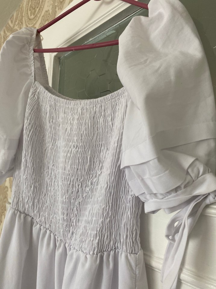Beyaz keten , drapeli tasarım, kayık yaka ve bol kesim ile. Askılı kolları ve midi boyuyla günlük kullanım için uygundur.