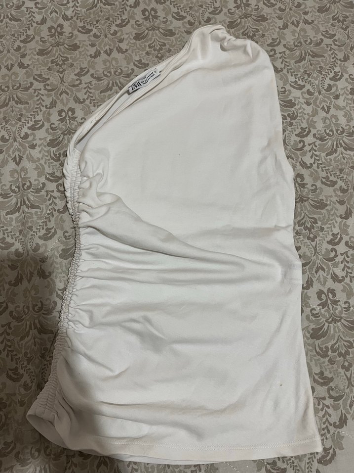 Beyaz keten kumaştan, straplez ve drapeli detaylara sahip. Fitted kesim, kolsuz ve midi boyda, minimalist sokak stili için uygun.