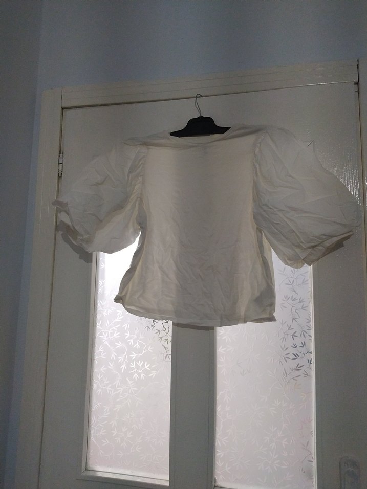 Beyaz keten bluz, drapeli straplez yakaya, kısa ve bol kollara, normal boyda tasarlandı. Bohem tarz için uygun.