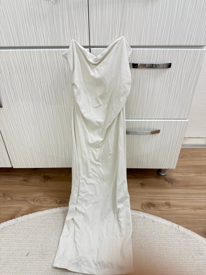 Beyaz uzun elbise, drapeli askılı yakası ve vücuda oturan kesimiyle minimalist düğünler için uygundur. Hiç giymedim cinsiyet partim için almıştım etiketini kestigim için iade edemedim