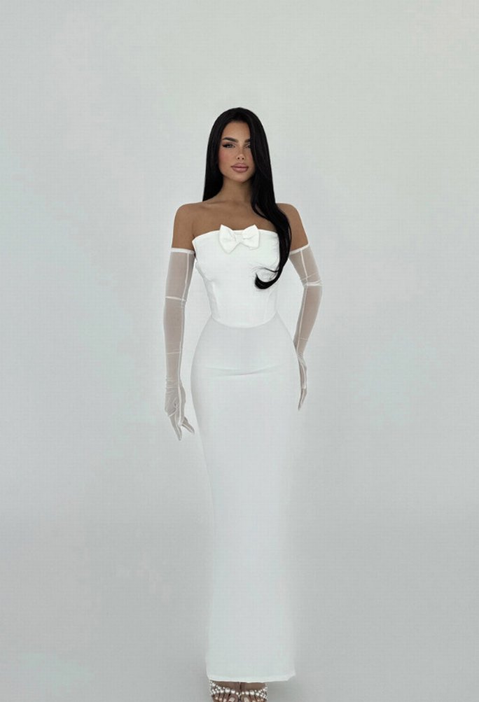 Beyaz keten kumaştan, straplez yaka ve drapeli detaylarla uzun, vücuda oturan elbise. Minimalist ve bohem tarzda, açık hava etkinlikleri için uygundur.Eldivenleride yanında birliktedir fotoğrafda koymayı unutmuşum.