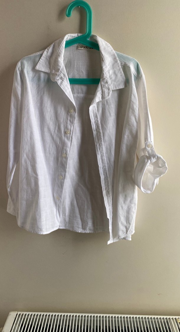 Beyaz keten kumaştan, düğmeli, yakalı ve uzun kollu bohem tarzda, rahat kesim erkek çocuk gömleği.