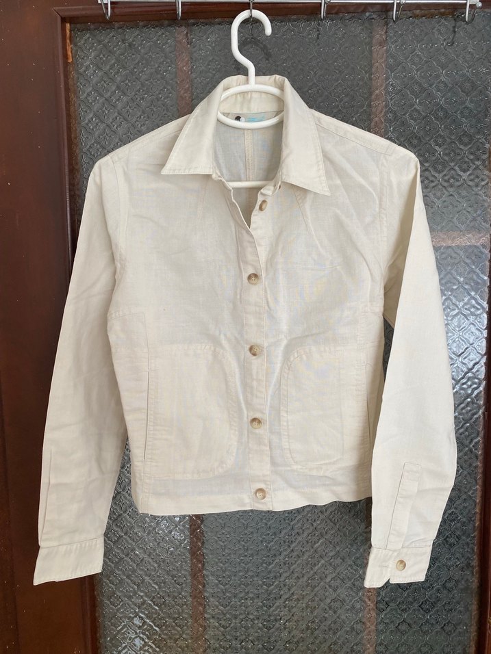 Beyaz keten kumaştan, düğmeli, uzun kollu, normal boyda ve rahat kesimli kadın ceket. Günlük sokak stili için uygundur.