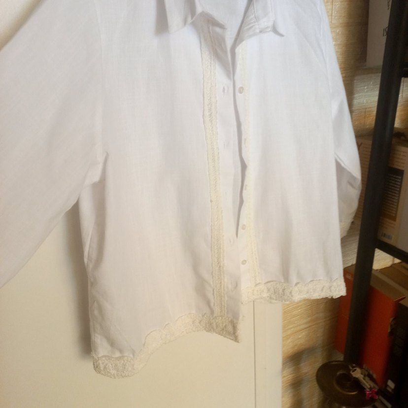Beyaz keten gömlek, yakalı ve fakir kollu. dantel detayları ile çok şık. ofis kullanımı için uygun. Hiç kullanılmadı. Hefiye geldi. Beden uyumsuzluğundan satışta. iki kol arası 54 cm, omuzdan boy 56 cm yarı fiyatına.