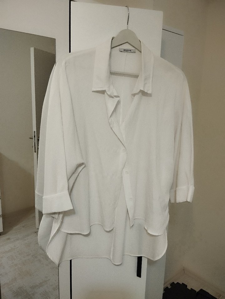 Beyaz keten, düğmeli, kısa kollu, normal midi boyda, minimal stil için uygun salaş kadın gömlek.