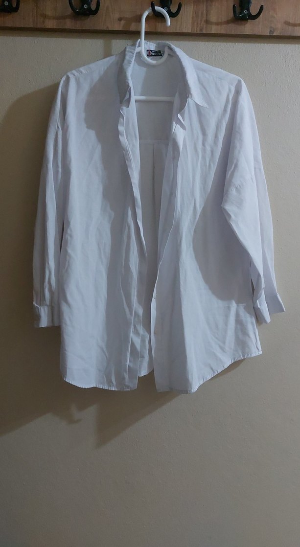 Beyaz keten gömlek, düğmeli, yakalı ve uzun kollu, bol kesim rahat bir yapıya sahiptir.