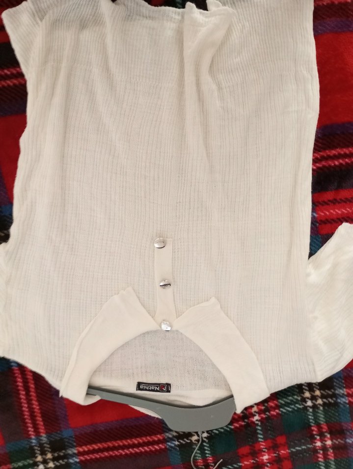 Beyaz keten kumaştan, düğmeli, bol kesim, uzun kollu, bisiklet yakalı ve midi boyda kadın gömlek. Günlük kullanım için rahat ve şık bir parça.