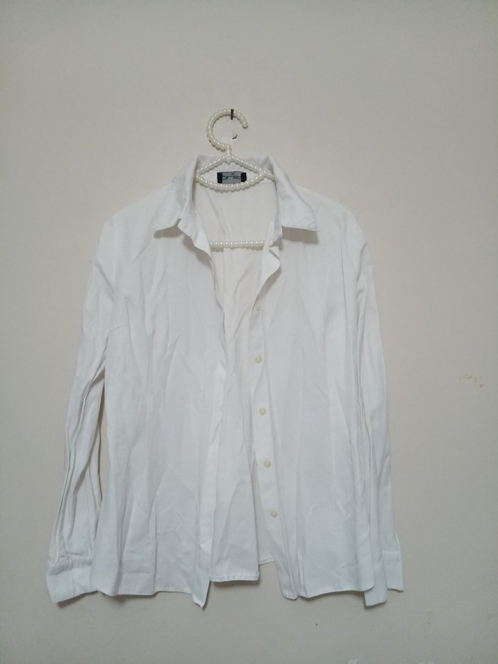 Beyaz keten gömlek, yakalı ve düğmeli, uzun kollu, normal boyda, parlak görünümlü, ofis için uygun sade bir modeldir.