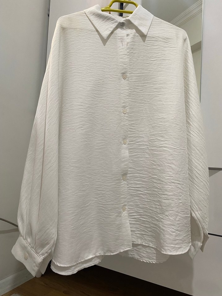 Beyaz keten kumaştan, düğmeli, yakalı ve uzun kollu, bol kesim midi uzunlukta minimal bohem tarzda kadın gömleği.
