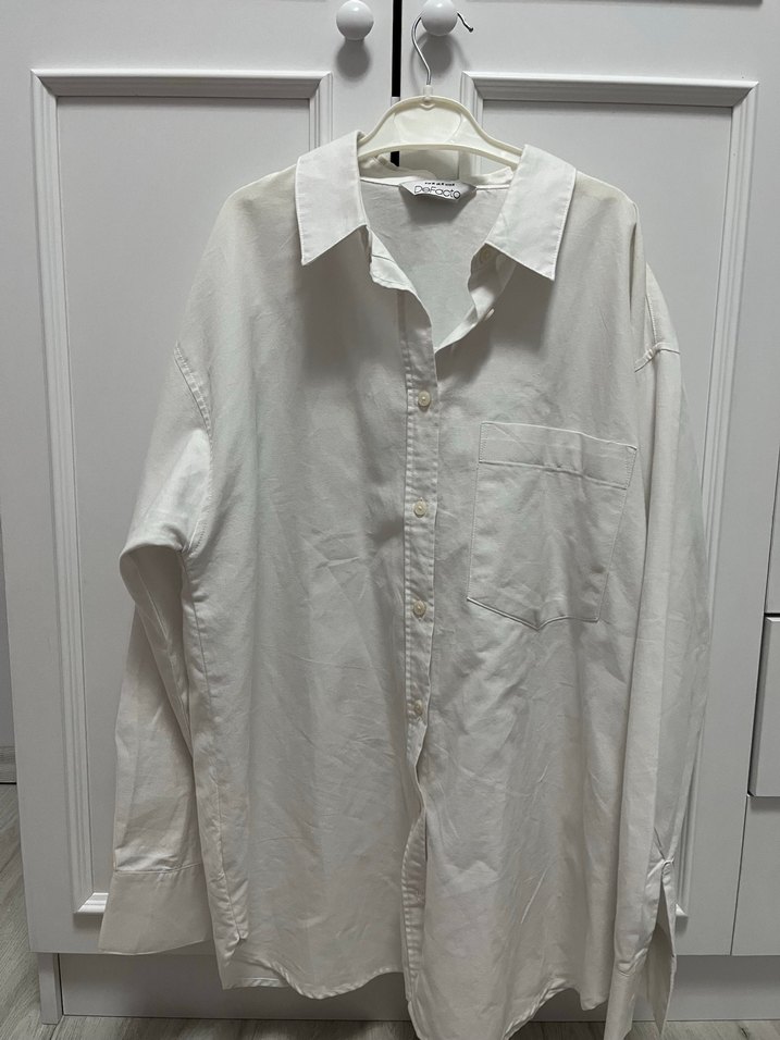 Beyaz keten kumaştan yapılmış, düğmeli ve yakalı, uzun kollu, bol kesim kadın gömleği. Minimalist ve desensiz tasarımı günlük kullanıma uygundur.