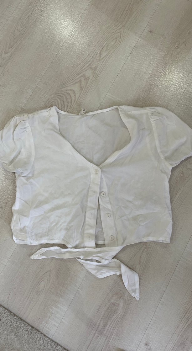 Beyaz keten bluz, kısa kollu, V yakalı ve düğmeli. Salaş, midi boy ve minimalist tarzda, günlük kullanıma uygun.