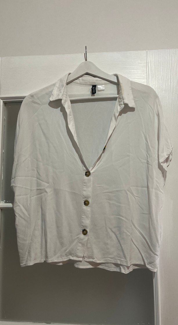 Beyaz keten kumaştan, kısa kollu ve düğmeli, yakalı, rahat kesim günlük sokak stili gömlek.