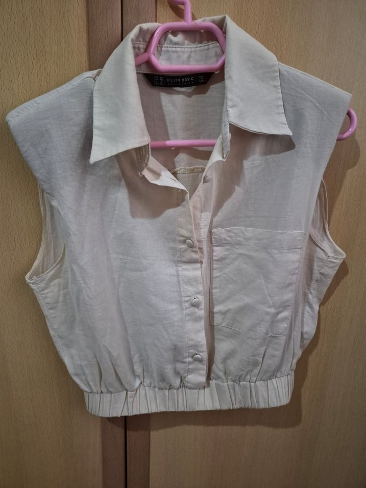 Beyaz Keten Düğmeli Kolsuz Mini Gömlek