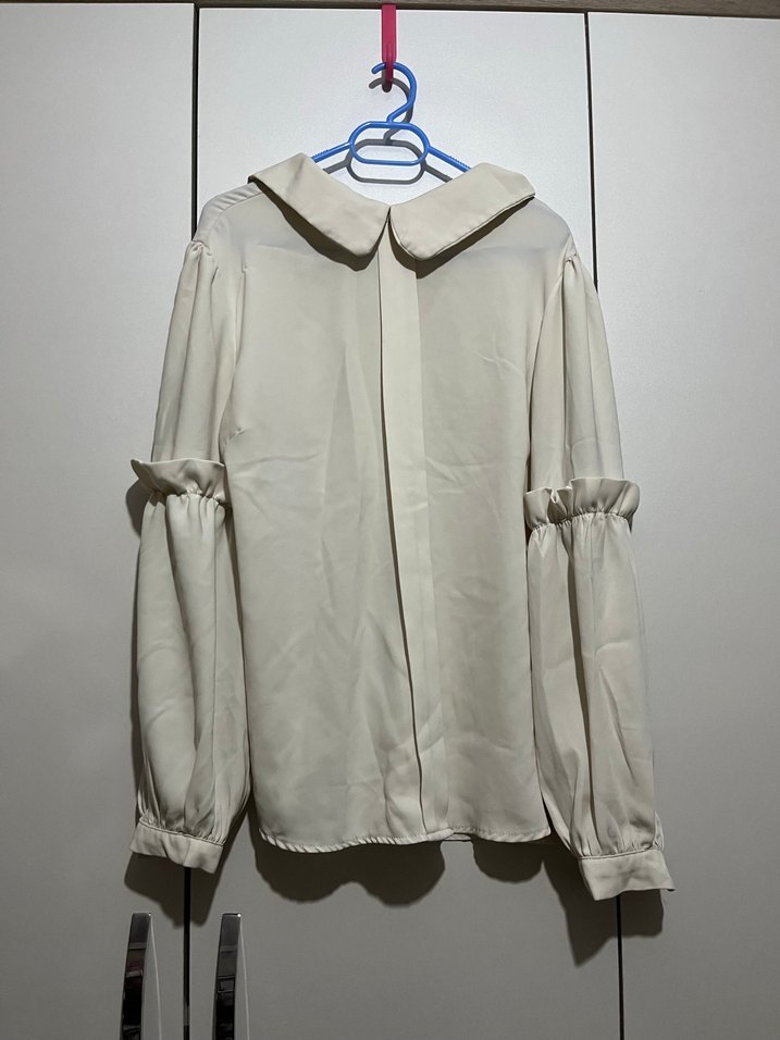 Beyaz keten kumaştan, düğmeli uzun kollu ve yakalı, rahat kesim gömlek. Ofis için uygundur.