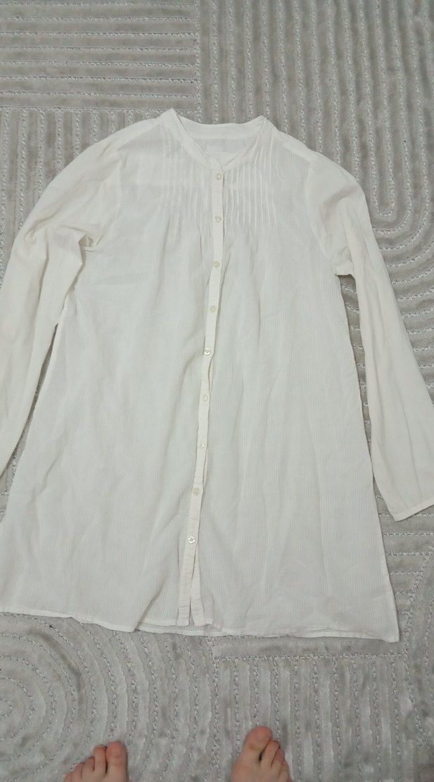 Beyaz keten gömlek, düğmeli önde, uzun kollu ve yakalıdır. Salaş kesim ve midi boy ile minimalist stile uygundur. yurt dışından geldi hiç giyilmedi