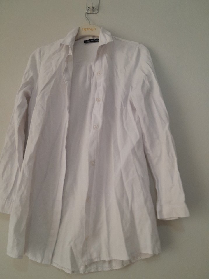 Beyaz keten, düğmeli, yakalı ve uzun kollu gömlek. Rahat ve bol kesimli, minimalist tarzda günlük kullanım için uygun. ✨