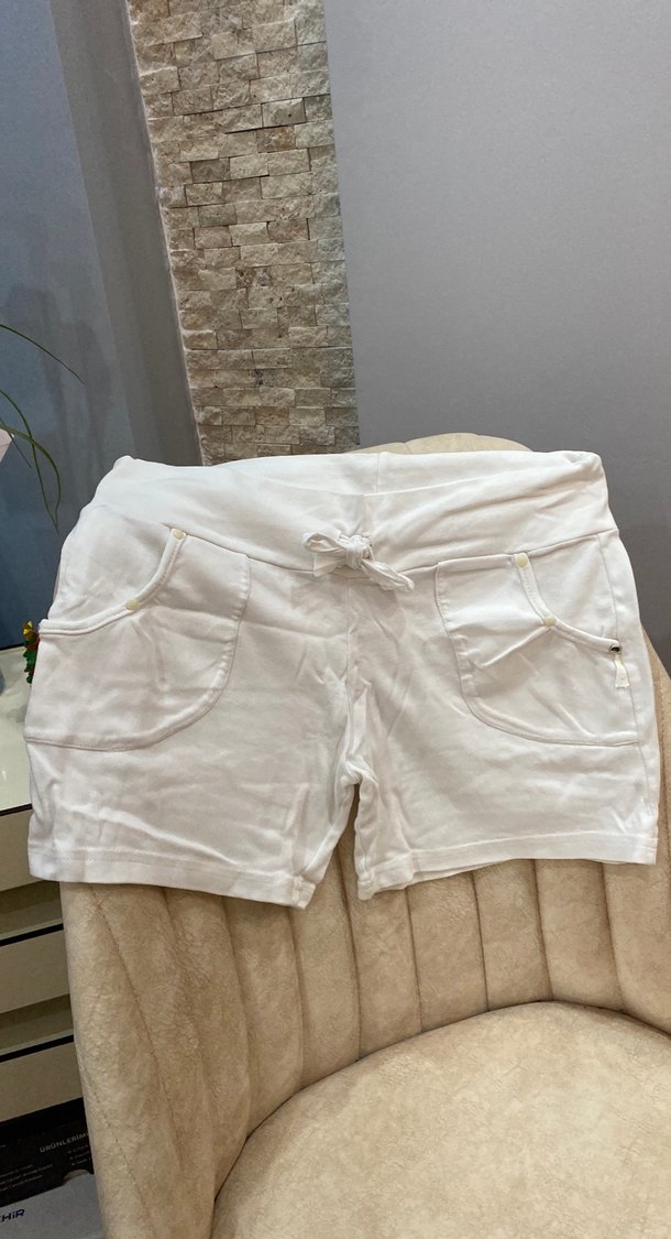 Beyaz keten mini şort, kısa boyu ve cepleriyle günlük rahatlık sağlar, sade ve şık bir görünüme sahiptir.