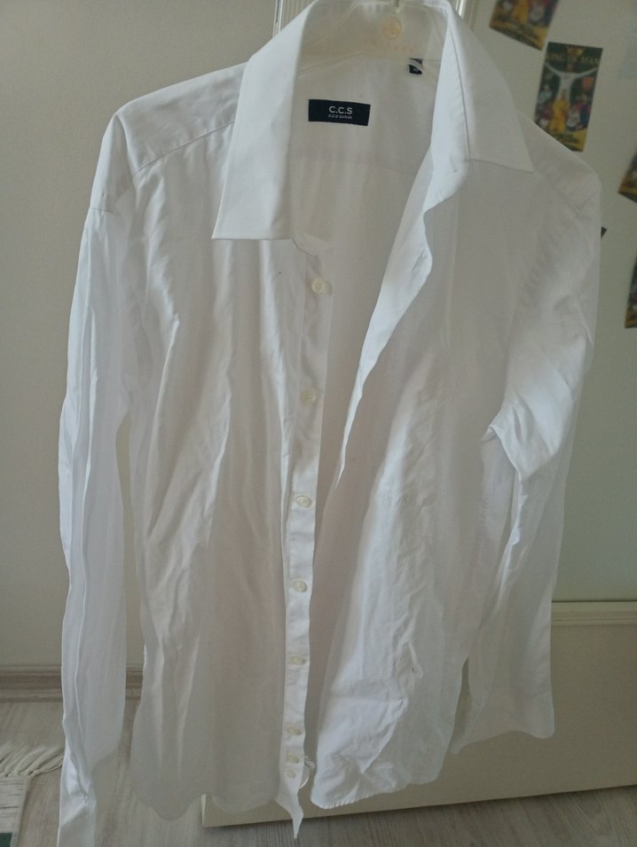 Beyaz keten erkek gömlek, yakalı ve uzun kolludur. Düğmeli, normal kesim ve parlak yüzeye sahiptir, ofis kullanımı için uygundur.