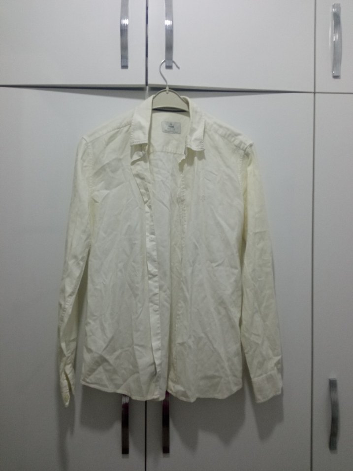 Beyaz keten kumaştan, uzun kollu ve yakalı erkek gömleği. Düğmeli ön kısmı ve regular fit kesimiyle günlük kullanıma uygun sade tasarım. Krem rengi.