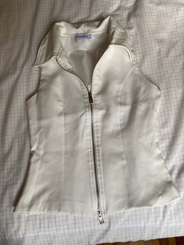 Beyaz keten kumaştan, fermuarlı ve yakalı, kolsuz kadın yelek. İnce kesimi ve midi boyu ile günlük sokak stiline uygun.