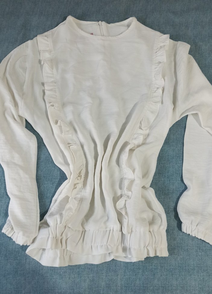 uzun kollu, yuvarlak yakalı, ön ve etek kısmında fırfır detaylı, bol kesim bluz. Bohem ve şık tarz için uygundur.