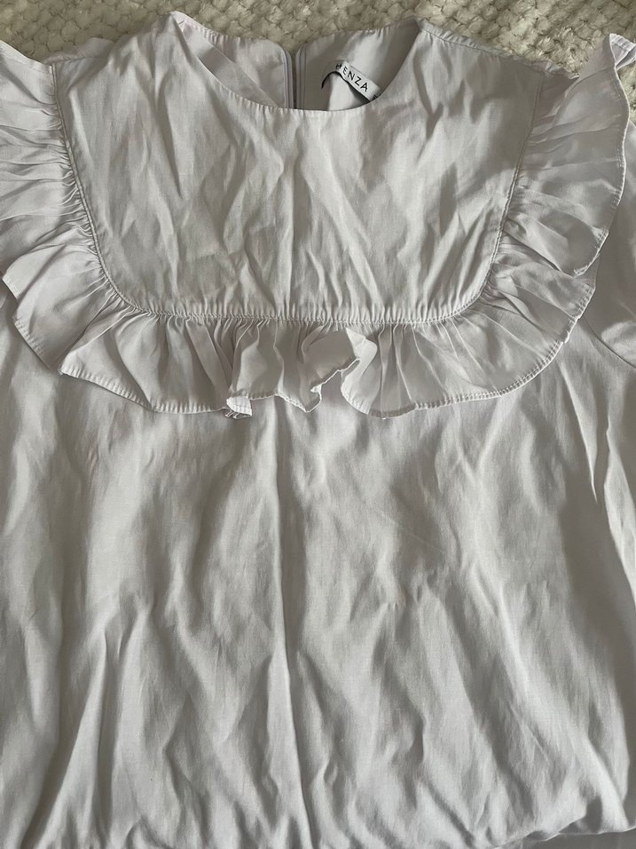 Beyaz keten kumaştan, fırfır detaylı, tekne yaka ve bol kesim bluzu. Rahat ve sade tasarımıyla günlük kullanıma uygundur.